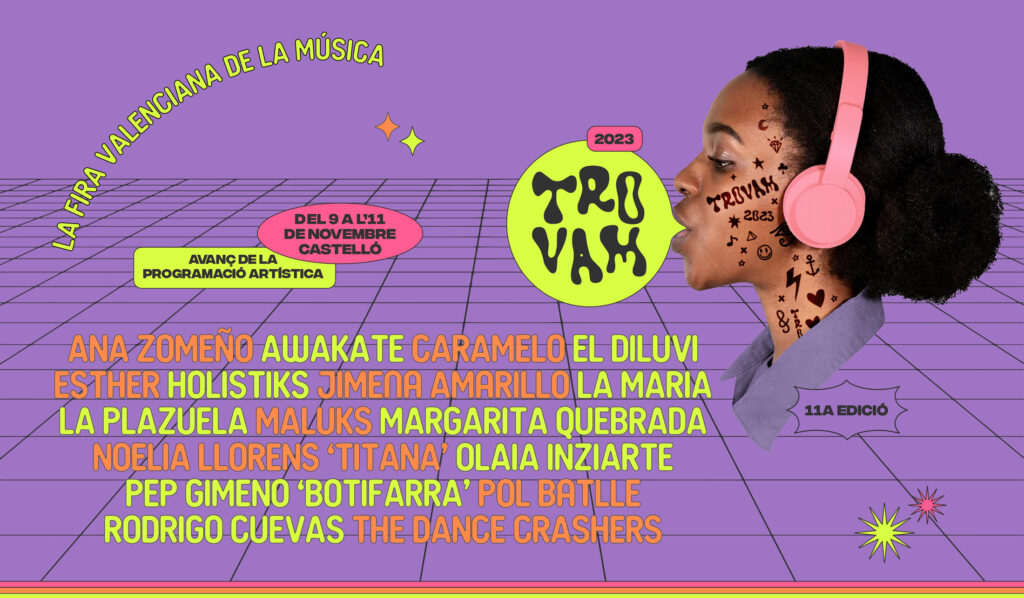 La Fira Valenciana de la Música Trovam presenta un adelanto de la programación artística que se desarrollará entre el 9 y el 11 de noviembre en Castelló de la Plana. En su undécima edición, la Fira mantendrá su vocación de escaparate de la escena musical valenciana con la presencia de intérpretes como Jimena Amarillo, El Diluvi, Pep Gimeno “Botifarra”, Esther, Maluks, La Maria y Noelia Llorens “Titana”. Además, actuarán Margarita Quebrada, Caramelo, Holistiks y Ana Zomeño. El cartel se completa con bandas y solistas llegados de otros puntos del Estado como los andaluces La Plazuela, el asturiano Rodrigo Cuevas, la navarra Olaia Inziarte, los murcianos Awakate y el catalán Pol Batlle.